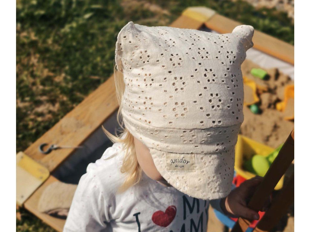 Šátek je ušitý z jemné madeiry, která je příjemná na nošení i v horkých dnech. Díky pružnému lemu se krásně přizpůsobí a padne dětem od batolecího věku až po větší slečny. Kšilt poskytuje praktické zastínění obličeje, takže se šátek skvěle hodí na hřiště, k vodě i na procházky.